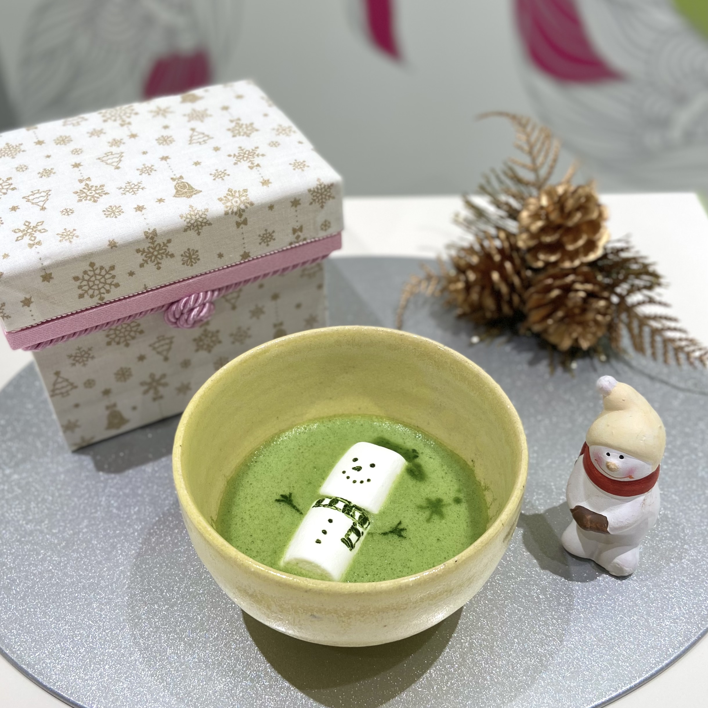 濃茶(お湯の量に対して多めの抹茶を用いた、とろみのある抹茶)でマシュマロに顔等を描き、2つくっ付けて薄茶に浮かべれば、雪だるま抹茶の完成❄️