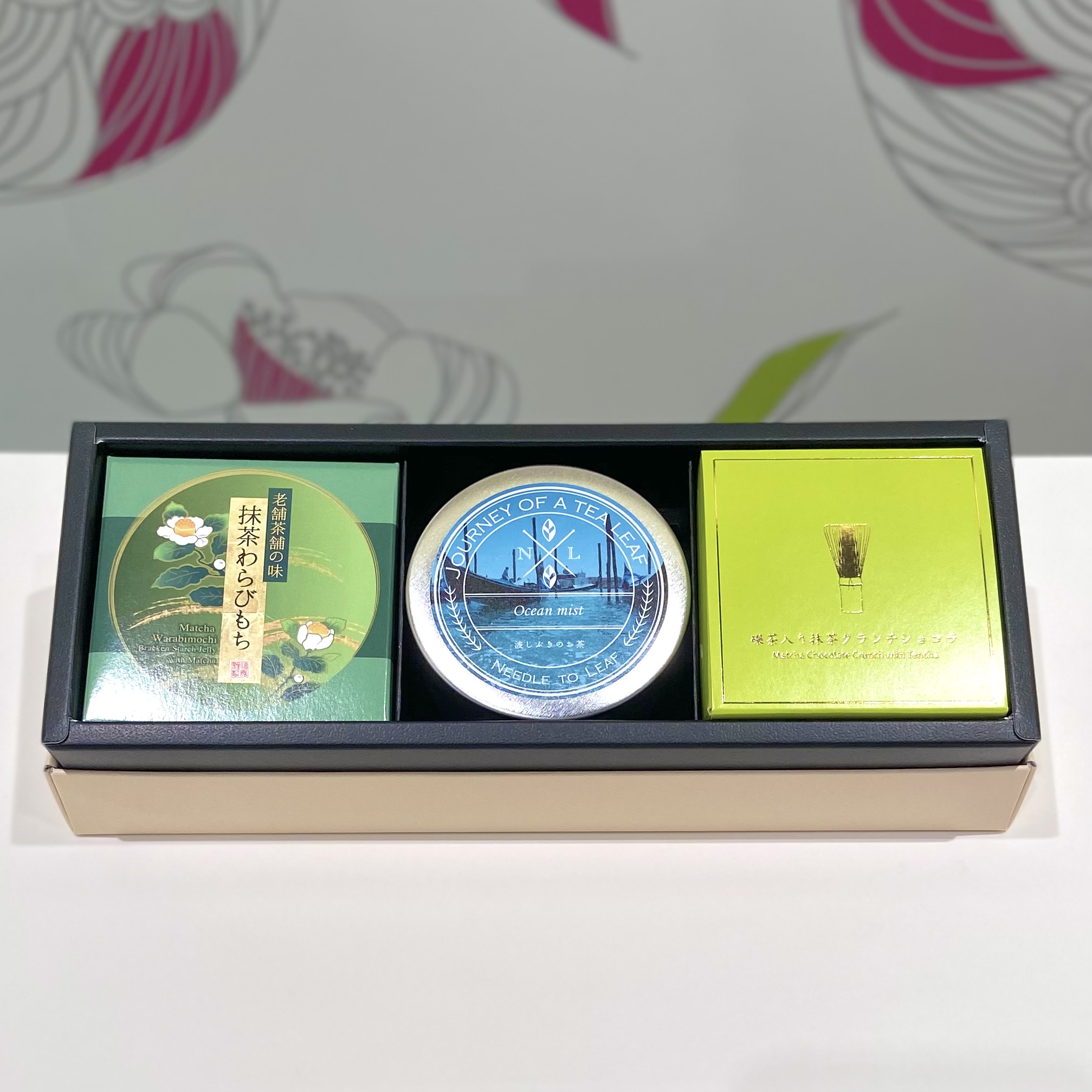 ▷碾茶(てんちゃ)入り抹茶クランチショコラ/波しぶきのお茶/抹茶わらびもち